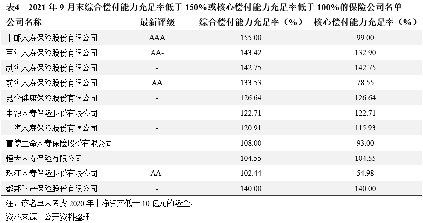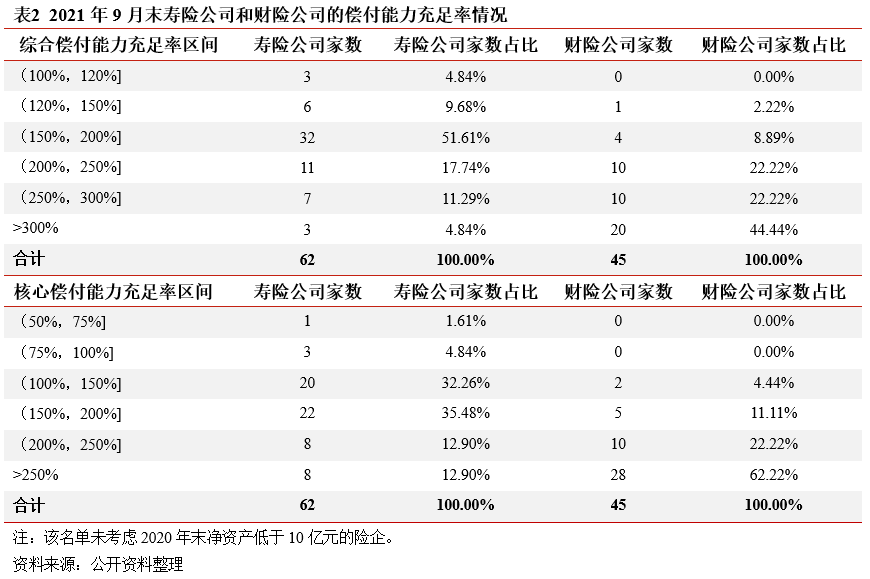 受償二代二期工程落地、壽險行業轉型及車險綜合改革影響,短期內保險公司償付能力充足率面臨下降壓力,其中壽險公司的下降壓力更大,補充資本動力更強。受壽險產品結構和代理人渠道轉型、車險綜合改革等影響,保險公司保費增速承壓,疊加償二代二期工程對險企資本認定趨嚴,短期內保險公司償付能力充足率有一定的下降壓力。償二代二期工程規定原計入核心一級資本的保單未來盈余將分別計入核心一級資本、核心二級資本、附屬一級資本和附屬二級資本,壽險公司的核心償付能力充足率的下降幅度或將大于綜合償付能力充足率,具有更為迫切的永續債發行需求。截至2021年9月末,最近一年末凈資產不低于10億元的壽險公司和財險公司償付能力充足率情況見下表,整體來看,財險公司的償付能力充足率水平要高于壽險公司。