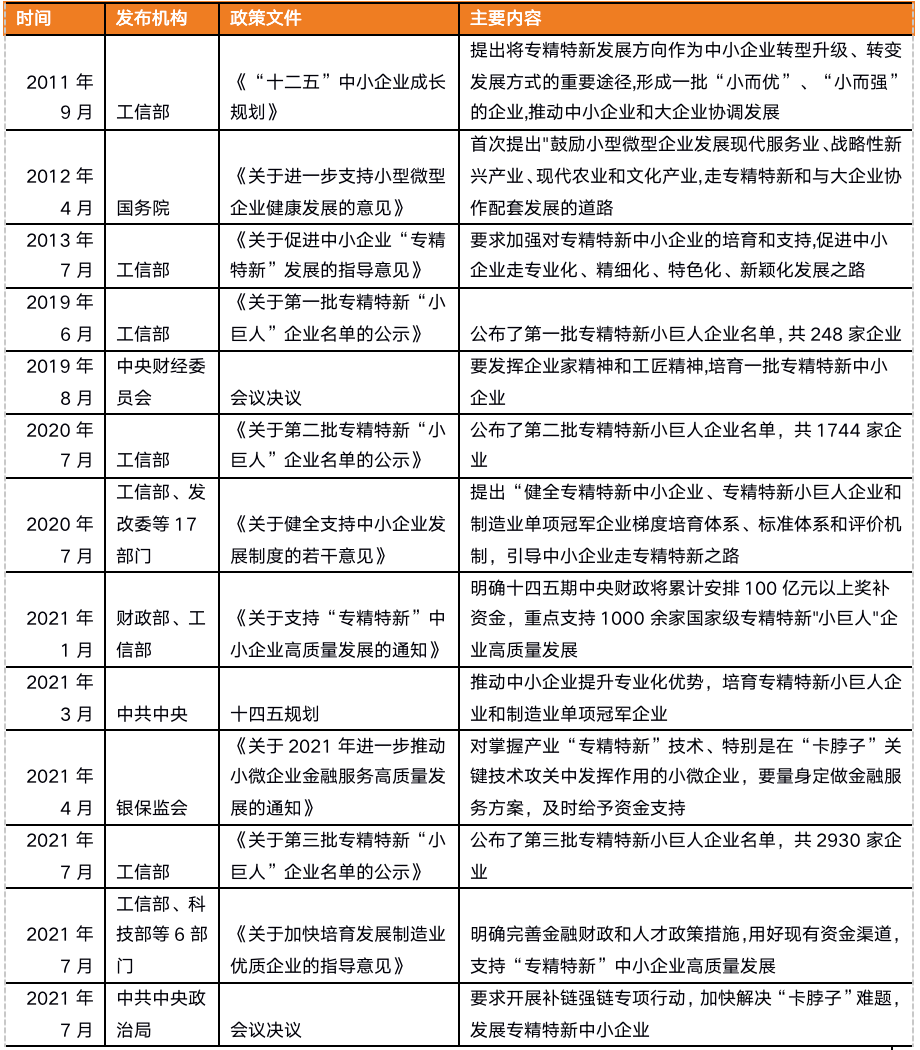 在2021年1月,財政部、工信部發(fā)布《關于支持“專精特新”中小企業(yè)高質量發(fā)展的通知》提出給與100億獎補資金支持,之后,培育專精特新“小巨人”被納入“十四五”規(guī)劃之中,銀保監(jiān)會為“專精特新”中小企業(yè)量身定制金融解決方案,工信部等6部委發(fā)文支持引導中小企業(yè)走“專精特新”之路,以及中共中央政治局會議強調發(fā)展“專精特新”中小企業(yè),至少在6個中央級重要政策、會議決議中提及“專精特新”。至此,國家政策給予的支持上升到了前所未有的高度。