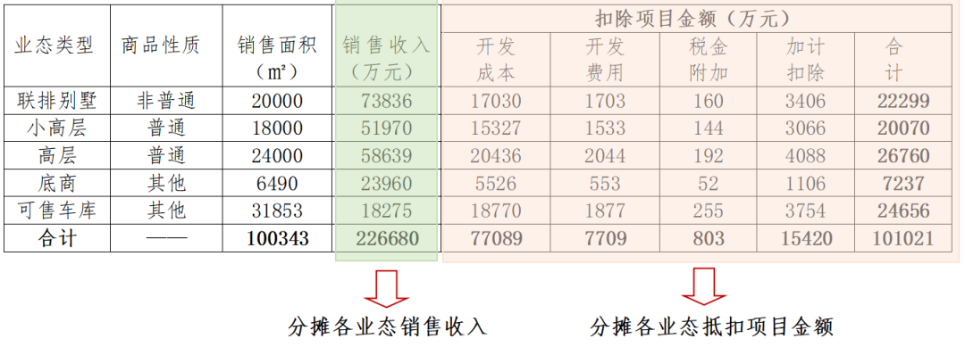 銷售收入的分攤方式通常沒有什么歧義,按照各業態銷售實際發生為準即可,但需注意的是如果涉及回遷住房,需考慮回遷物業視同銷售收入。