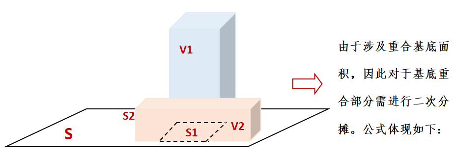 與占地面積、建筑面積分攤邏輯相似,即按照轉讓部分的對應的投影基底面積占可轉讓總基底面積的比例進行分攤。值得注意的是,對于涉及基底面積重合的業態,在公用一個基底面積的情況下,往往根據基底面積進行一次分攤后,再根據重合基底的兩個業態的建筑面積進行二次分攤。如下圖所示,高層及其下底商公用部分基底面積S1,底商未與住宅相接的基底面積為S2;設高層可售建面V1,底商可售建面V2,項目總基底面積S