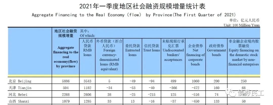 1、根據中國人民銀行2021年一季度地區社會融資規模增量統計表,河北省的企業債券融資金額為-516億元,位列全國倒數第一,這個金額比引發信用債券市場大波動的永煤事件所在的河南(-271億元)、華晨集團所在的遼寧(-295億元)還要低。在沒有出現重大信用債券負面輿情的情況下,這個數據真的是讓人震驚了。