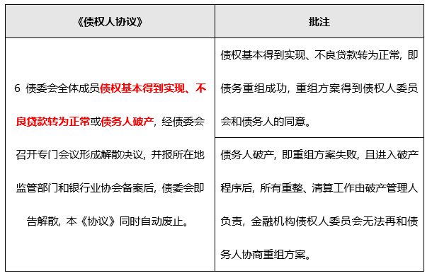所以, 總的來說, 金融機構債權人委員會所主導的債務重組徹底成功(債權基本得到實現、不良貸款轉為正常)或者徹底失敗(債務人破產)的情況下, 金融機構債權人委員會都有可能解散。