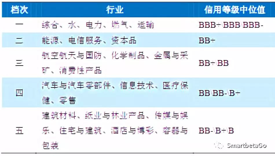 行業維度看,大致可以分為三塊工作。第一是充分借鑒賣方行業研究的成果。第二是針對行業信用風險,抓住各行業顯著特性,根據行業景氣度及行業違約概率(參見:標普每年出具的《Annual Global Corporate Default Study》)確定行業中長期級別中樞??蓞⒖寄碌?、標普、惠譽給予不同行業敞口不同信用評級中樞的做法,如下圖五: