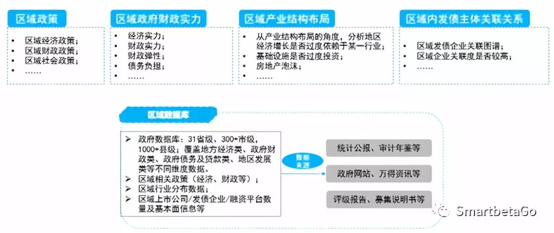 區域維度看,可以通過整理區域政策、區域政府財政實力情況、區域產業結構分布、區域內發債主體關系,搭建自己的區域數據庫,如下圖六: