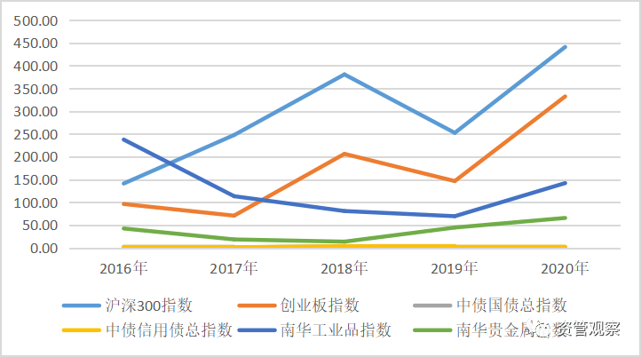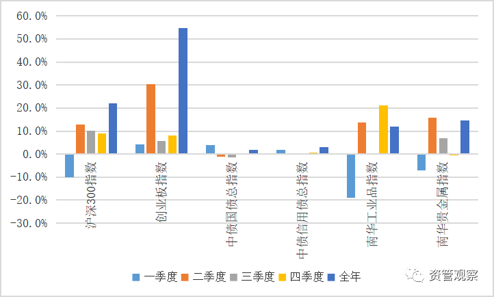 雖然經(jīng)歷了疫情的無(wú)情沖擊,但是整體來(lái)看,資產(chǎn)價(jià)格依然取得了較好的收獲,風(fēng)險(xiǎn)資產(chǎn)投資收益明顯好于安全資產(chǎn),股票資產(chǎn)好于大宗商品,大宗商品好于債券資產(chǎn),體現(xiàn)了疫情有效控制以及積極財(cái)政政策和貨幣政策對(duì)于投資者信心的提振。全年(截至12月18日,下同)來(lái)看,創(chuàng)業(yè)板投資收益達(dá)到54.6%,位居首位;滬深300指數(shù)收益率為22.1%,位居次位;貴金屬、工業(yè)品指數(shù)分別實(shí)現(xiàn)了14.5%和11.8%的收益率;信用債和國(guó)債指數(shù)的收益率僅為1.8%和3%,尚未跑贏通貨膨脹。不過(guò)季度趨勢(shì)看,滬深300指數(shù)和創(chuàng)業(yè)板指數(shù)都經(jīng)歷了二季度之后的收益率下滑,國(guó)債和信用債相對(duì)而言一季度和四季度表現(xiàn)更佳,貴金屬波動(dòng)性較大,二三季度實(shí)現(xiàn)了較大幅度的正收益率,而一、四季度投資收益率明顯下滑,工業(yè)品期貨相對(duì)而言二四季度表現(xiàn)更好。