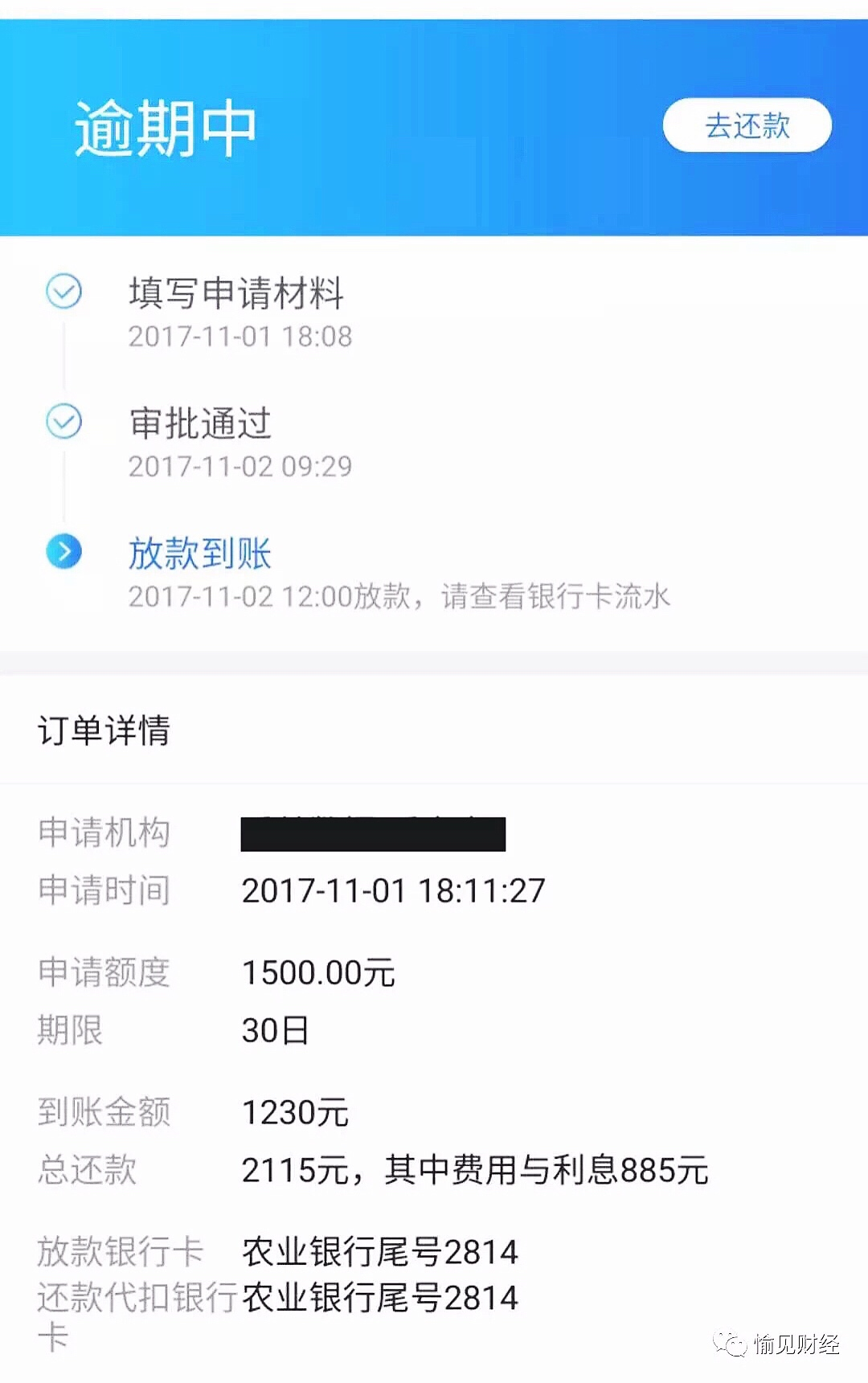 雖然并非家家網貸都榨取高息,但的確有相當一部分,利息不菲,或是利息聽起來似乎不高,但加上砍頭息、手續費、滯納金、罰息,就夸張了。比如阿良這筆借款,額度1500元,到賬1230元,他借款一個月后還不上,聽說逾了兩三期吧,吃罰息滯納金,最后一共要還2155元。