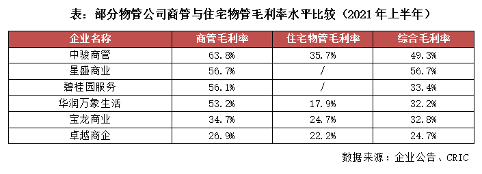 二是,商管毛利率水平更高,對物管公司整體盈利能力起到拉升作用。可以看到,2021年上半年中駿商管的商業物業管理及運營服務業務的毛利率高達63.8%,高出住宅物業管理服務業務28.1個百分點。星盛商業、碧桂園服務、華潤萬象生活的商管毛利率也都超過50%,展現出高收益性特征。卓越商企的商管業務綜合毛利率相較偏低,為26.9%,主要原因在于卓越商企的商管業務主要來自母公司卓越集團和第三方物業開發商,其中來自母公司卓越集團的商管業務毛利率處在高位,達47.9%,但來自第三方物業開發商的商管業務毛利率僅為14.3%,拉低了整體水平。