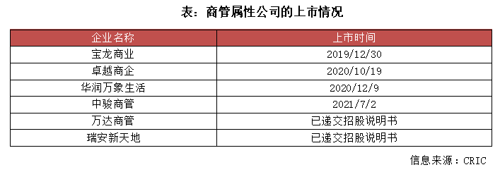 商管作為一種以商業物業為依托提供運營管理服務的輕型化業態,將業務觸角延伸到傳統住宅領域之外的優質資產,價值挖掘空間可期。尤其是隨著星盛商業、中駿商管成功上市,瑞安新天地、萬達商管相繼啟動IPO,以及龍頭品牌碧桂園也強勢入局,引發行業對商管航道的關注和想象。