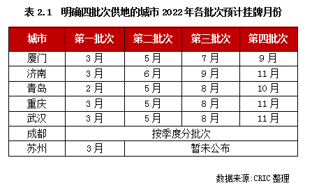 重點城市22年集中供地最顯著的一大變化便是部分城市將供地批次由三批次增加至四批次,目前已有青島、廈門、成都、濟南、蘇州、重慶和武漢等七個城市明確提出2022年集中供地將分為四批次進行。其中,除成都和蘇州外,其余城市均公布了余下三批次的掛牌時間。從掛牌時間來看,這些城市的集中供地基本均是按照季度來分批供應,僅廈門計劃在第三季度完成所有的供應計劃。
