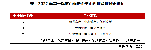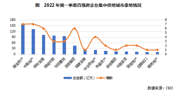 拿地金額總量較高的建發、中海和保利也是一季度在集中供地城市落子范圍最廣的3個房企,在4個城市有所斬獲,主要包括廈門、北京、合肥和福州;其次龍湖和中交在三個城市落子,龍湖主要在深耕區域內的成都、重慶拿地,中交則在武漢、成都和青島拿地。
