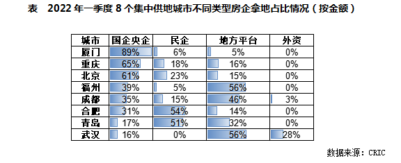 廈門、重慶和北京以國企央企拿地為主,如中海、金地、建發、國貿和象嶼共計拿下廈門7宗含宅地塊,重慶則有中海、華潤、建發、大悅城、中鐵等大型國企央企積極落子,北京則是華潤、中海、保利、金地、城建發展、中國建筑等多家國企央企拿地。