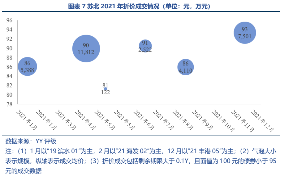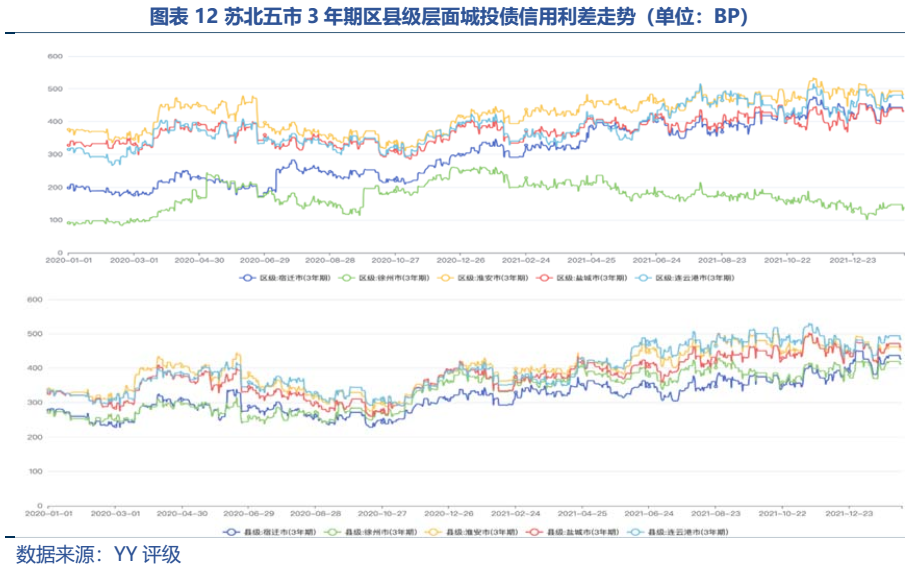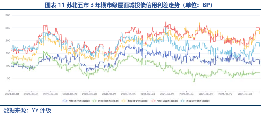 從區域利差來看,五市中徐州的市場認可度最好(21年末3年期市級利差69.56BP),債務負擔較輕的宿遷次之;其他三市的利差表現則偏弱,21年末以來有一定走擴。