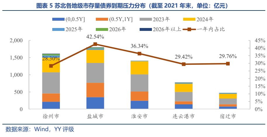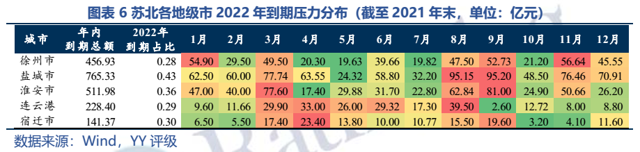 從存量債券來看,截至21年末區域城投債余額合計6,073.25億元(作為參考,同期末湖南7,656億元)。細分來看,鹽城市債券余額最多(1,799.08億元),綜合實力最強的徐州次之,淮安相較于其體量而言規模偏大(YY Ratio 1,451.96%,全省最高),宿遷余額最小(473.97億元)。另外注意到鹽城市2022年債券到期壓力較大(年內到期占比超40%)。