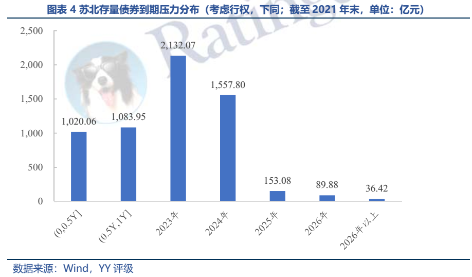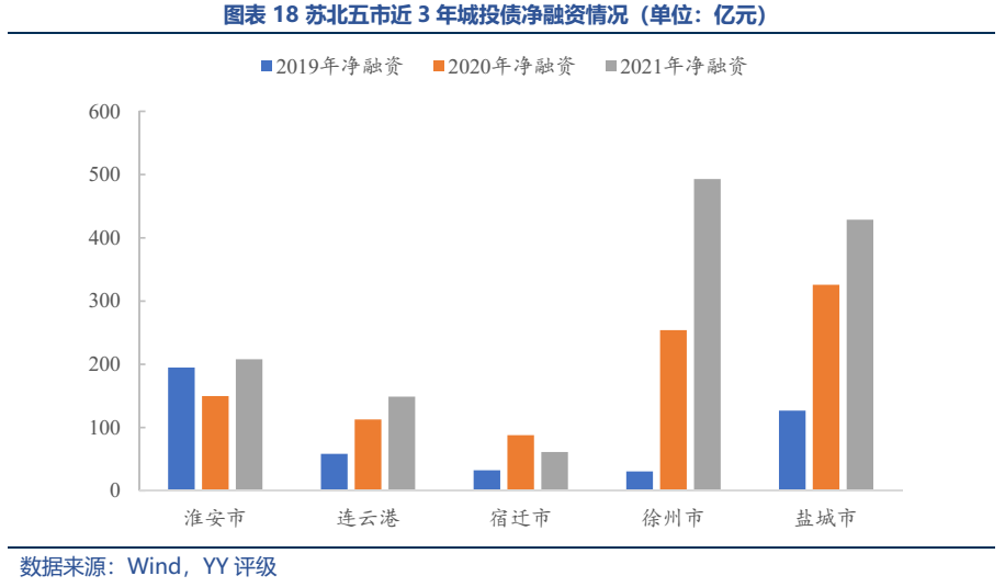 雖然目前區域再融資環境仍較好,19-21年城投債凈融資分別為443億元、930億元和1,339億元。且城投不應割裂開來看,如果從江蘇全省一盤棋的角度出發,蘇大強信仰的支撐強,屬于靠自身、靠省里,仍有積極的空間,安全距離較大。