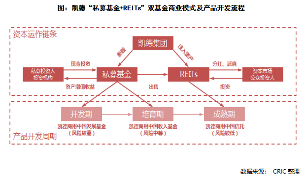 根據(jù)商業(yè)項(xiàng)目從籌備建設(shè)、開(kāi)業(yè)初期、穩(wěn)定運(yùn)營(yíng)各環(huán)節(jié)的發(fā)展需要,凱德一般會(huì)對(duì)應(yīng)不同類型的金融產(chǎn)品。一般來(lái)看,開(kāi)發(fā)期和培育期的商業(yè)物業(yè),由于高風(fēng)險(xiǎn)、高收益的項(xiàng)目特點(diǎn),凱德主要用房地產(chǎn)私募基金進(jìn)行投資;對(duì)于現(xiàn)金流穩(wěn)定的成熟商業(yè)物業(yè),風(fēng)險(xiǎn)相對(duì)較小,凱德主要用REITs進(jìn)行投資而后實(shí)現(xiàn)退出,形成完整的投資和退出閉環(huán),且在此過(guò)程中,REITs通常對(duì)私募基金培育的項(xiàng)目具有優(yōu)先購(gòu)買權(quán)。至此,凱德已經(jīng)形成了“私募基金培育,再打包出售給REITs”的雙基金配對(duì)運(yùn)作模式。