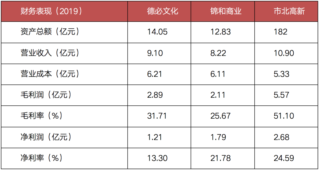 備注:德必、錦和在總資產與市北高新相差10倍的前提下,營業收入相差無幾。