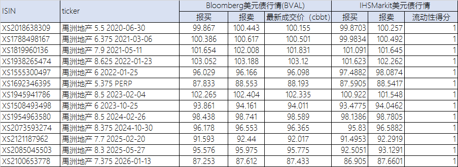 禹洲的Bloomberg美元債行情以及IHSMarkit美元債對照行情,如下表所示: