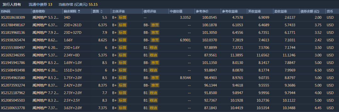 目前,禹洲共有13筆離岸債券,當前存續55.15億美元,今年有1筆余額為2億美元的離岸債到期。