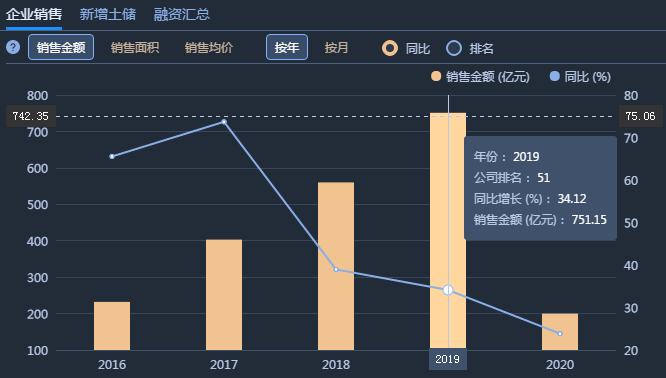 2019年全口徑合同銷售金額751.2億元,同比增長34.1%,還未邁進千億門檻;
