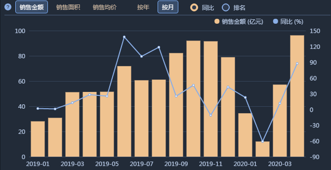 從月度銷售數據看,由于疫情原因,今年2月份是禹洲的銷售低谷,4月份直竄至96.27億元,同比增長87.41%。