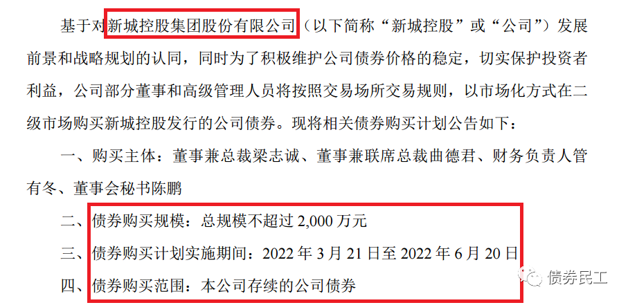 2、新城控股集團(tuán)股份有限公司3月18日公告,公司部分高管以市場(chǎng)化方式在二級(jí)市場(chǎng)購(gòu)買不超過(guò)2000萬(wàn)元本公司發(fā)行的公司債券。目前新城控股存續(xù)債券21只,包括公司債券、資產(chǎn)證券產(chǎn)品、中期票據(jù)和定向工具。其中存續(xù)公司債券8只,存續(xù)公司債券金額為62.32億元。新城控股最近一次發(fā)行債券是在2021年6月29日發(fā)行了規(guī)模為2.548億元的“新城01優(yōu)”、“新城01次”。
