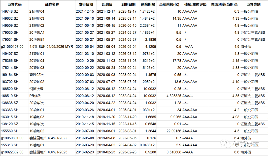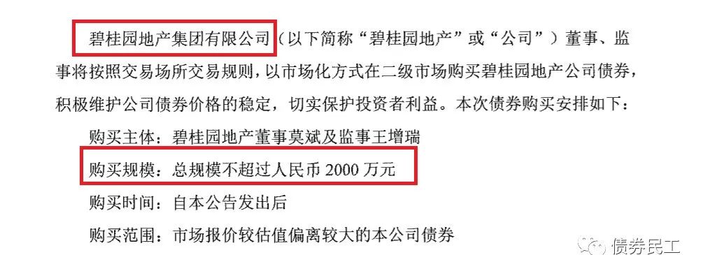 1、碧桂園地產(chǎn)集團(tuán)有限公司于2022年3月17日公告,公司部分董事和監(jiān)事以市場(chǎng)化方式在二級(jí)市場(chǎng)購(gòu)買不超過(guò)2000萬(wàn)元本公司發(fā)行的公司債券。目前碧桂園存續(xù)債券21只,包括公司債券、資產(chǎn)證券產(chǎn)品和美元債券。其中存續(xù)公司債券10只,存續(xù)公司債券金額為165.05億元。碧桂園最近一次發(fā)行債券是在2021年12月15日發(fā)行了規(guī)模為10億元的“21碧地04”,票面利率6.3%。
