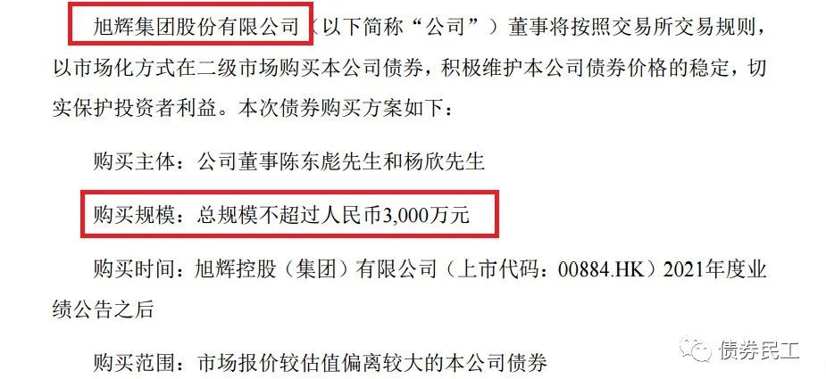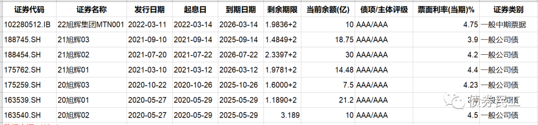 3、旭輝集團(tuán)股份有限公司于2022年3月21日公告,公司部分董事以市場(chǎng)化方式在二級(jí)市場(chǎng)購(gòu)買不超過(guò)3000萬(wàn)元本公司發(fā)行的公司債券。目前旭輝集團(tuán)存續(xù)債券7只,包括公司債券和中期票據(jù)。其中存續(xù)公司債券6只,存續(xù)公司債券金額為101.93億元。旭輝集團(tuán)最近一次發(fā)行債券是在2022年3月14日發(fā)行了規(guī)模為10億元的“22旭輝集團(tuán)MTN001”,票面利率4.75%。