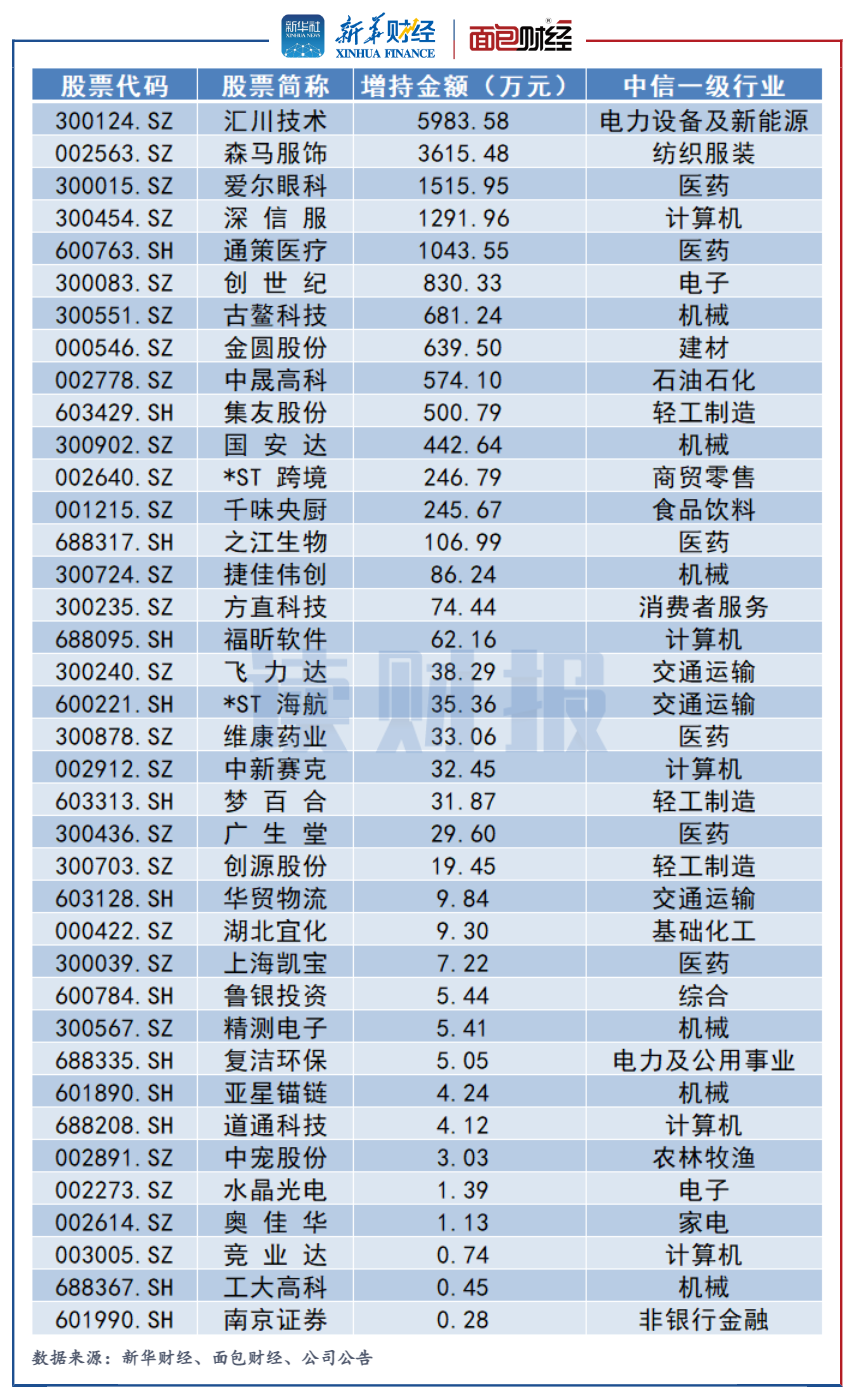 中信行業分類下,電子設備及新能源行業的增持金額排在首位,約為5983.58萬元,紡織服裝行業的增持金額排在第二,約為3615.48萬元。醫藥行業的增持金額也排名靠前,約為2736.36萬元。