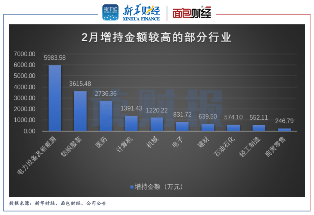 紡織服裝行業中,增持金額來自森馬服飾。數據顯示,森馬服飾3位董監高在2月合計增持了3615.48萬元。