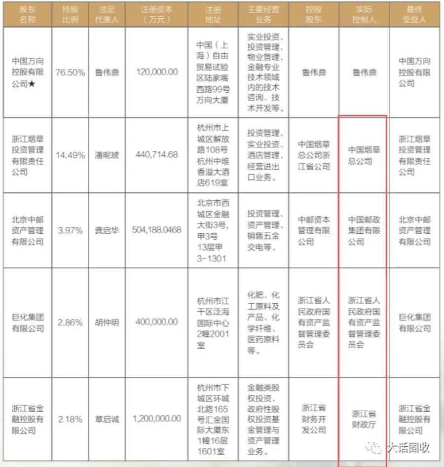不一樣的不在于大股東,而在于其他幾個小股東,來頭都“不小”;第二大股東浙江煙草投資,實控人是中國煙草總公司;第三大股東中國中郵,實控人是中國郵政集團;末位倆股東,實控人分別是浙江省國資委和浙江省財政廳。