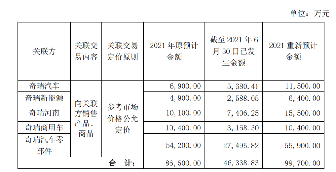 2021年9月末,伯特利曾披露《關于增加預計公司2021年度日常關聯(lián)交易的公告》。公司基于2021年上半年與奇瑞汽車及其關聯(lián)方業(yè)務開展情況以及發(fā)生的實際交易金額,預計公司2021年全年與奇瑞汽車及其關聯(lián)方將增加關聯(lián)交易1.32億元。