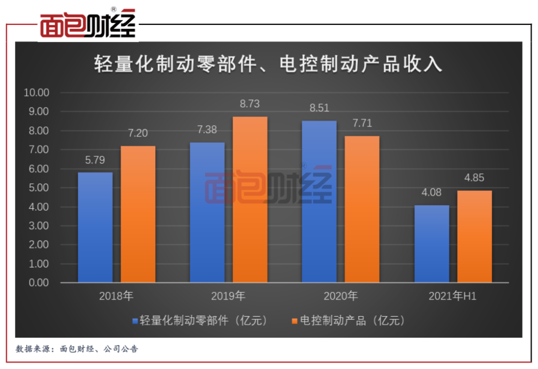 在市場寄予厚望的輕量化制動零部件、電控制動產品這兩大業(yè)務方面,伯特利2020年輕量化制動零部件實現(xiàn)收入8.51億元,同比增長約15%;電控制動產品實現(xiàn)收入約7.71億元,相比上年的8.73億元甚至出現(xiàn)下降。