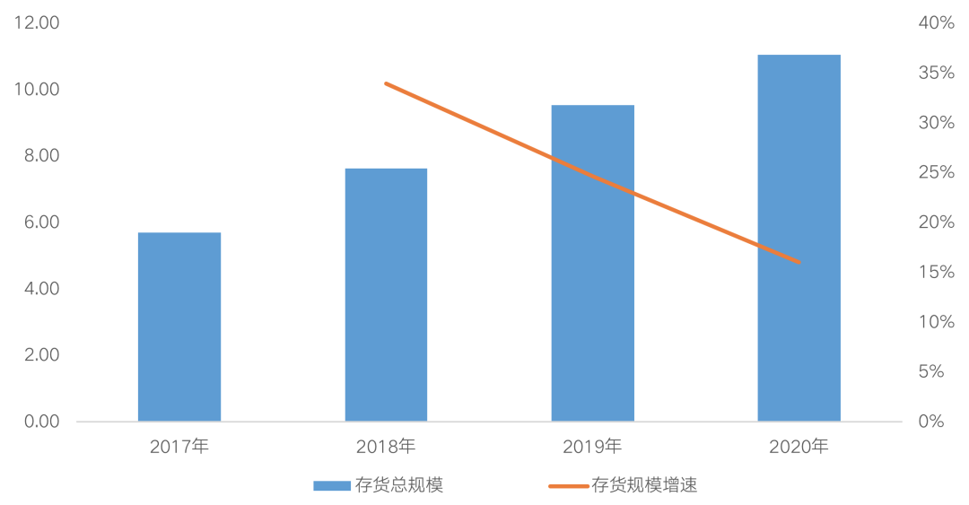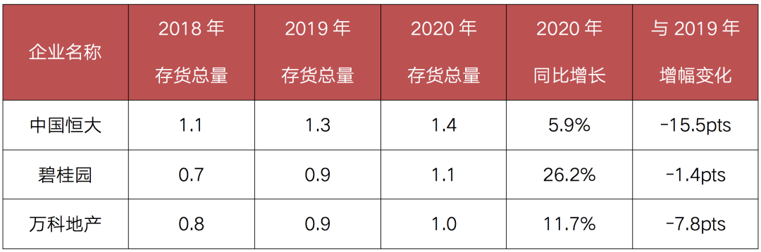 從企業(yè)角度而言,截至2020年底,存貨規(guī)模達到萬億的房企有三家,分別是恒大1.4萬億元、碧桂園1.1萬億元和萬科1萬億元,其中碧桂園和萬科是首次進入萬億行列。