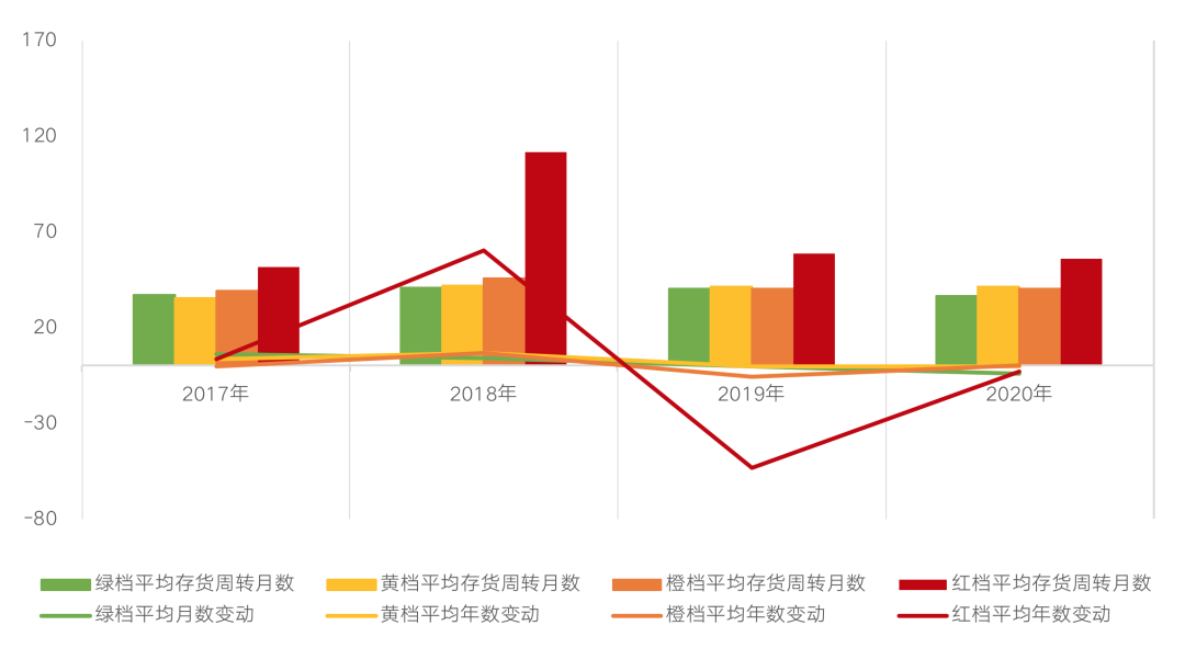 橫向比較來看,2020年紅檔房企的周轉(zhuǎn)速度最慢,平均存貨周轉(zhuǎn)月數(shù)在55.7個月,綠檔房企周轉(zhuǎn)速度最快,周轉(zhuǎn)月數(shù)達到了36.3個月。自2019年以來各檔位都在著手去庫存,尤其是紅檔房企下降最多,2020年仍在持續(xù)加快周轉(zhuǎn)速度。綠檔房企本身周轉(zhuǎn)速度就較快,在新規(guī)頒布后行動敏銳,平均周轉(zhuǎn)月數(shù)下降了4.2個月;其次是紅檔房企,在2019年大幅加快周轉(zhuǎn)效率后,2020年持續(xù)提高周轉(zhuǎn)速度,平均存貨周轉(zhuǎn)月數(shù)較上年下降了3個月。