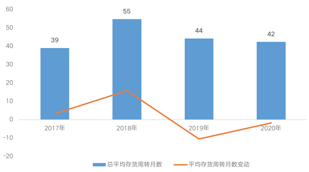 2019年房企增長速度明顯放緩,市場整體去化承壓,行業(yè)視角回歸至去庫存。2020年,突遇新冠疫情,開工與施工進度被推遲,隨著經(jīng)濟秩序逐漸恢復(fù),下半年以來房企積極趕工,全年存貨周轉(zhuǎn)天數(shù)較2019年進一步縮短,平均存貨周轉(zhuǎn)月數(shù)為42個月(約3.5年),較上年下降1.8個月(約54天)。