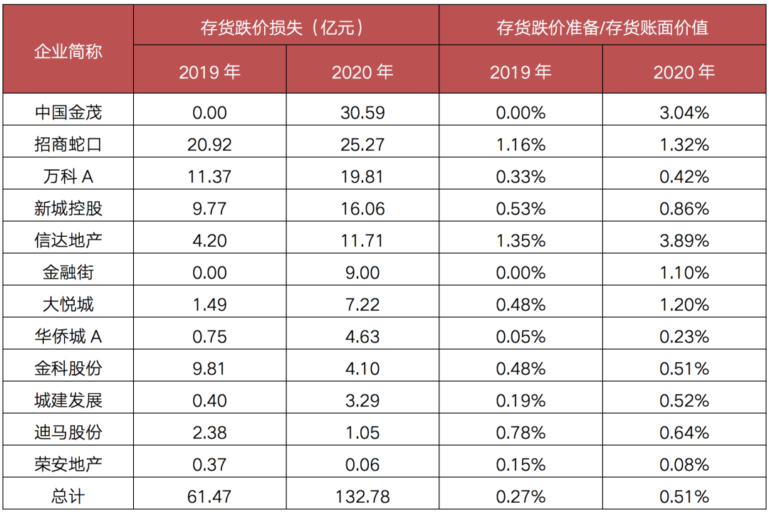 據(jù)CRIC監(jiān)測,2020年12家企業(yè)計提的存貨跌價損失同比增長超過一倍,中國金茂、金融街在年內(nèi)計提了比較大額的存貨減值,拖累了企業(yè)盈利;而招商蛇口則連續(xù)兩年計提超過20億元的存貨減值,萬科、新城、信達等2020年計提存貨減值金額都有明顯上升。