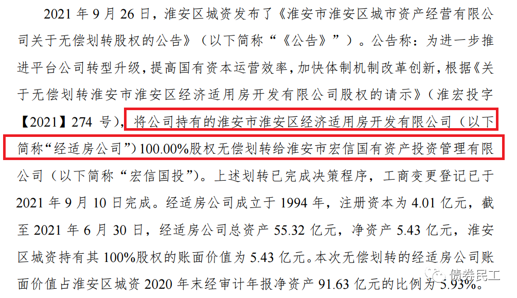 1、淮安市淮安區(qū)城市資產(chǎn)經(jīng)營(yíng)有限公司公告,將公司持有的淮安市淮安區(qū)經(jīng)濟(jì)適用房開發(fā)有限公司的股權(quán)無償劃轉(zhuǎn)給淮安市宏信國(guó)有資產(chǎn)投資管理有限公司(控股股東為淮安區(qū)人民政府)。