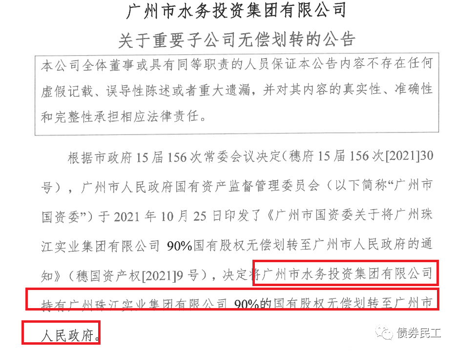 3、廣州市水務(wù)投資集團(tuán)有限公司(主體信用評(píng)級(jí)為AAA)公告,將公司持有的廣州珠江實(shí)業(yè)集團(tuán)有限公司90%的股權(quán)無償劃轉(zhuǎn)給廣州市人民政府。此次劃轉(zhuǎn)完成之后,公司不再持有廣州珠江實(shí)業(yè)集團(tuán)有限公司的股權(quán)。