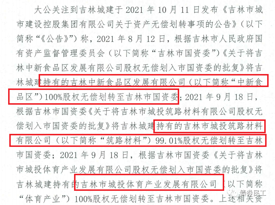 7、吉林市城市建設(shè)控股集團(tuán)有限公司(主體信用評(píng)級(jí)為AA+)公告,將吉林中新食品區(qū)發(fā)展有限公司100%股權(quán)、吉林市城投筑路材料有限公司99.01%股權(quán)和吉林市城嘔吐體育產(chǎn)業(yè)發(fā)展有限公司100%股權(quán),劃轉(zhuǎn)至吉林市國(guó)資委。