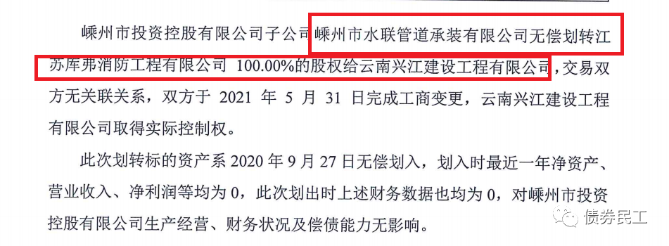 6、嵊州市投資控股有限公司(主體信用評(píng)級(jí)為AA+)公告,將子公司持有的江蘇庫(kù)弗消防工程有限公司100%的股權(quán)無償劃轉(zhuǎn)給云南興江建設(shè)工程有限公司(實(shí)際控制人為自然人)。不過該劃出的子公司凈資產(chǎn)、營(yíng)業(yè)收入和凈利潤(rùn)均為0。