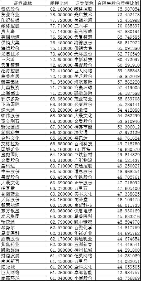 下表分別是質(zhì)押比例、限售股質(zhì)押比例前50的公司。