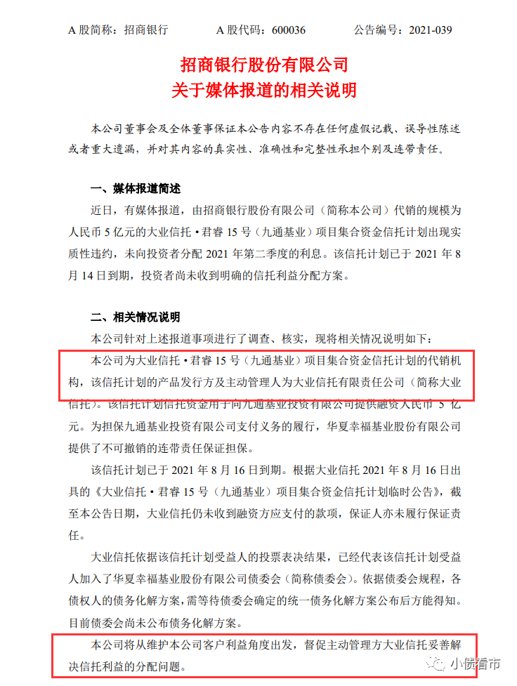 同時,招商銀行也發(fā)布澄清公告稱,其為上述信托計劃的代銷機(jī)構(gòu),將從維護(hù)本公司客戶利益角度出發(fā),督促主動管理方大業(yè)信托妥善解決信托利益的分配問題。