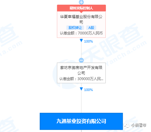 從股權(quán)結(jié)構(gòu)看,九通投資是京御房地產(chǎn)100%控股子公司,是華夏幸福間接全資子公司,公司實際控制人為王文學(xué)。