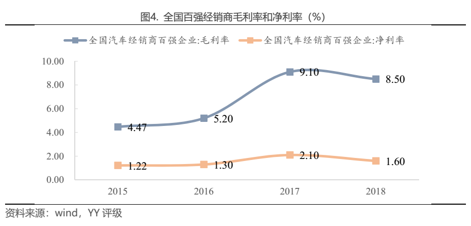 雖然新辦法打破了授權(quán)單一體制,但汽車廠商仍然通過供貨、返利等方式控制了銷售渠道,且會(huì)去4S店購車的人往往也是沖著官方授權(quán)以及汽車使用周期內(nèi)的全方位服務(wù)體驗(yàn)去的,因此品牌授權(quán)仍是4S店的主要銷售形式。當(dāng)前汽車經(jīng)銷商對于購銷兩頭的議價(jià)能力都較弱,廠商通常在制定指導(dǎo)零售價(jià)時(shí)給予經(jīng)銷商 4~6%的購銷差價(jià)空間。由于行業(yè)競爭激烈,經(jīng)銷商往往將大部分購銷差價(jià)讓利給客戶以爭奪客源,利潤空間進(jìn)一步被壓縮,因此銷售利潤非常依賴于廠商后期提供的銷售返點(diǎn),甚至出現(xiàn)為了獲得返利超負(fù)荷拿車、價(jià)格倒掛的情況。