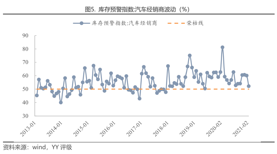 經(jīng)銷商庫存預(yù)警指數(shù)是庫存滯留資金/流通資金,以50%為榮枯線,2015年以來我國經(jīng)銷商庫存預(yù)警指數(shù)平均值為57.0%,長期位于榮枯線以上,意味著庫存壓力長期較大。2020年2月,受疫情影響,汽車銷路不暢,4S店庫存積壓,庫存預(yù)警指數(shù)達(dá)到81.2的%的歷史高點(diǎn),隨后隨著疫情緩解,汽車銷量恢復(fù),庫存指數(shù)有所回落。至2021年2月,即傳統(tǒng)淡季,庫存預(yù)警指數(shù)落至52.2%,已經(jīng)低于往年2月份的預(yù)警指數(shù),短期進(jìn)入相對安全區(qū)間。