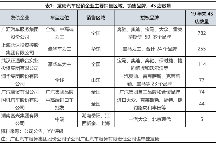 業(yè)務(wù)方面,國機(jī)汽車主營進(jìn)口車批發(fā)貿(mào)易,零售規(guī)模較小。其他發(fā)債主體以4S店零售為主,其中廣汽物貿(mào)主要銷售廣汽自主和合資品牌,永達(dá)集團(tuán)、武漢正通以寶馬、奧迪、奔馳等豪華車品牌銷售為主,富興集團(tuán)僅有5家4S店,授權(quán)品牌僅一汽大眾、北京現(xiàn)代兩家,廣匯集團(tuán)、潤華集團(tuán)則品牌布局較全面。從銷售區(qū)域來看,潤華集團(tuán)、永達(dá)集團(tuán)為區(qū)域性經(jīng)銷商,分別主要布局在山東、華東區(qū)域,其他經(jīng)銷商(除僅5家店的富興集團(tuán))則布局分散。截至2019年末,第一大經(jīng)銷商廣匯集團(tuán)4S店數(shù)量達(dá)782家,上海永達(dá)、武漢正通4S店數(shù)量也超過100家,而國機(jī)汽車以批發(fā)為主、零售為輔,4S店數(shù)量相對較少。