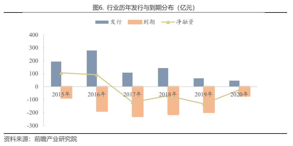 經(jīng)歷2015年、2016年兩年大規(guī)模融資,自2017年以來,汽車銷售行業(yè)凈融資額持續(xù)為負(fù),或與近些年來汽車銷售增速放緩,汽車銷售企業(yè)減緩?fù)卣?S店的步伐,從而資金需求減弱所致。2020年,行業(yè)債券發(fā)行額與到期額均大幅減少,僅發(fā)行46.7億元(其中34億元都是由廣匯集團(tuán)及其子公司發(fā)行),到期70.7億元,凈融資規(guī)模為-24.0億元。總體來說,債券市場對于汽車銷售行業(yè)并不友好。