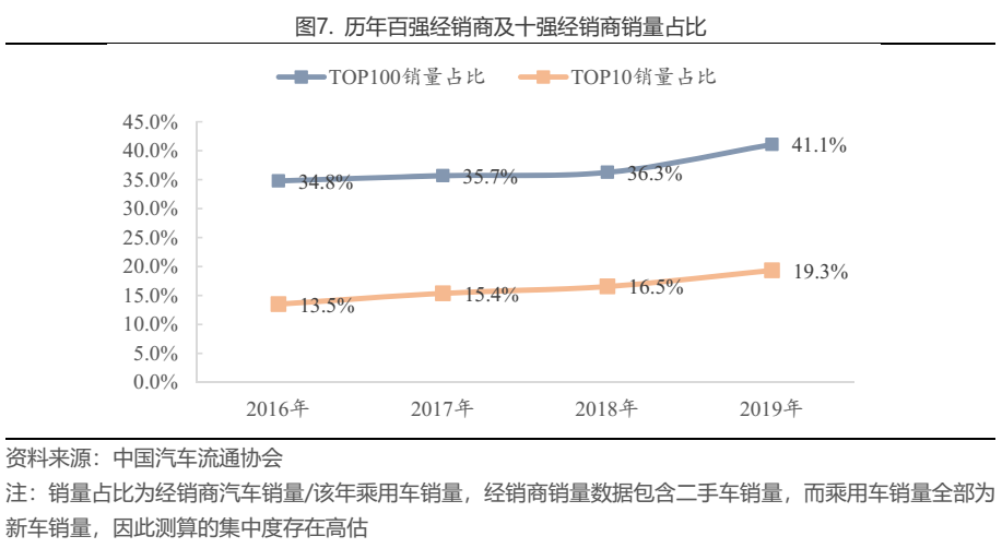 雖然目前汽車銷售行業(yè)仍呈現(xiàn)“大群體、小個(gè)體”的狀態(tài),但近些年來的集中度提升是顯著的,尤其是前十名經(jīng)銷商的集中度由2016年的13.5%提升至2019年的19.3%。
