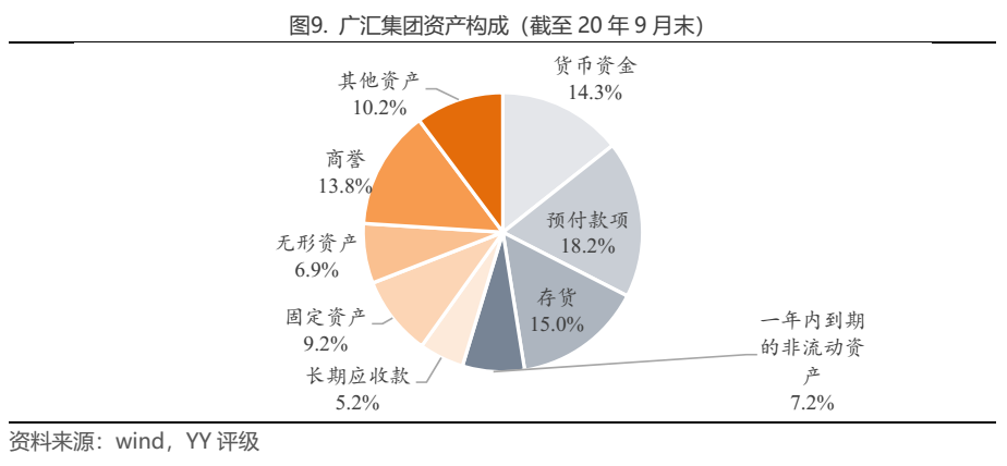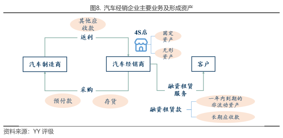 從汽車經(jīng)銷公司的資產(chǎn)構(gòu)成來看,若不考慮其他業(yè)務(wù),則主要有貨幣資金、存貨、對上游廠商的預(yù)付款、廠商返利款等形成的其他應(yīng)收款,4S店鋪、運(yùn)輸工具等固定資產(chǎn),土地使用權(quán)形成的無形資產(chǎn)。若4S店主要為租賃店,則資產(chǎn)流動(dòng)性很強(qiáng),非流動(dòng)資產(chǎn)少,而若自持店較多,則固定資產(chǎn)、無形資產(chǎn)乃至在建工程等慢周轉(zhuǎn)的資產(chǎn)占比會(huì)更高。由于整車零售下游主要是個(gè)人,因此形成應(yīng)收賬款、應(yīng)收票據(jù)很少,僅有刷卡未到賬形成很少量應(yīng)收賬款。另一方面,隨著汽車經(jīng)銷商拓展融資租賃業(yè)務(wù),也會(huì)形成融資租賃款,通常一年內(nèi)到期的部分計(jì)入一年內(nèi)到期的非流動(dòng)資產(chǎn),一年以上的部分計(jì)入長期應(yīng)收款。另外,若歷史收購行為較多,賬上也可能累積大規(guī)模商譽(yù),如廣匯集團(tuán)賬上商譽(yù)達(dá)188.8億元,占總資產(chǎn)的比例達(dá)13.7%。
