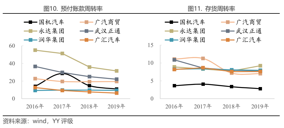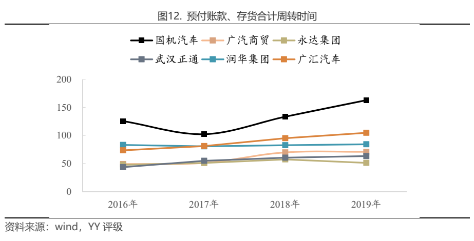 以預(yù)付賬款、存貨合計(jì)周轉(zhuǎn)時(shí)間即購銷完整周期來看(不考慮應(yīng)收賬款),永達(dá)集團(tuán)周轉(zhuǎn)時(shí)間最短,2019年為51.1天,廣汽商貿(mào)、武漢正通19年周轉(zhuǎn)時(shí)間也在80天內(nèi),而國機(jī)汽車周轉(zhuǎn)時(shí)間達(dá)162.8天,2017年以來周轉(zhuǎn)顯著減慢。6家企業(yè)平均周轉(zhuǎn)時(shí)間約3個(gè)月,若剔除國機(jī)汽車,周轉(zhuǎn)時(shí)間約2個(gè)半月。